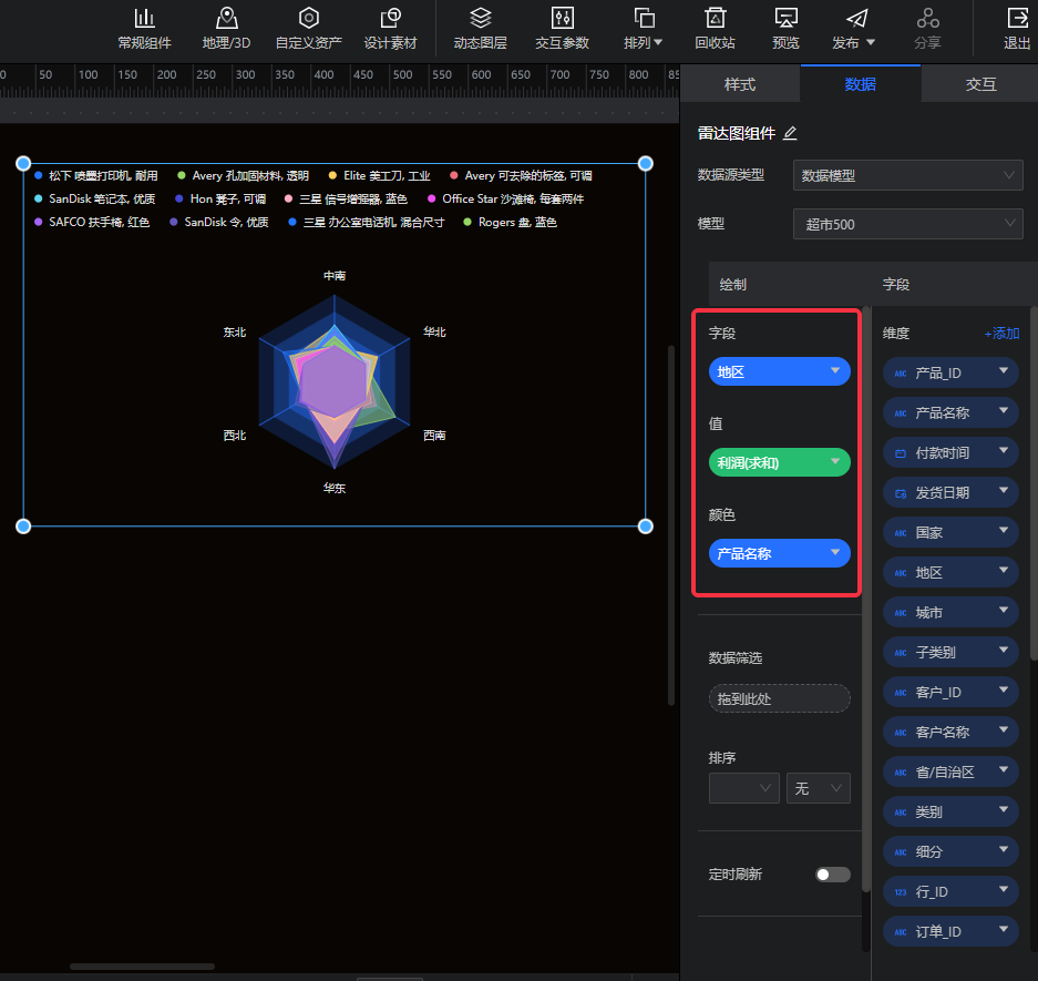 - 字段:设置雷达图的维度字段,如下图所示为“地区”。