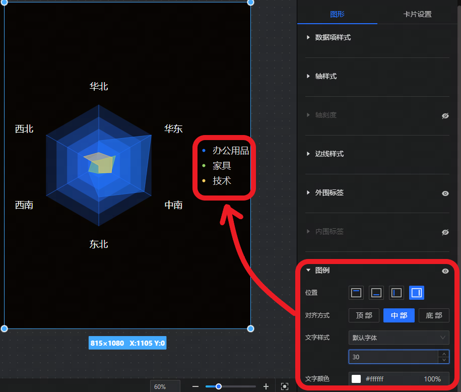 - 图例:设置图例的位置、对齐方式、文字样式,以及文字颜色。