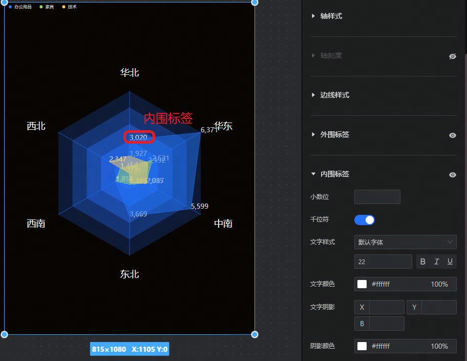 - 内围标签:设置雷达图是否显示内围标签,以及内围标签样式。