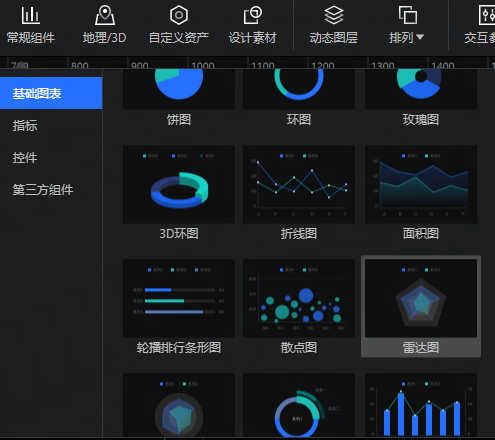在编辑状态下点击雷达图组件即可对其进行配置,配置内容分为样式、数据和交互三个Tab。(本节仅介绍雷达图特有属性的配置,基础图表共性的配置请参考下文"组件配置")
