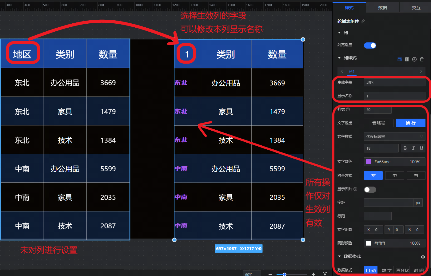 表头:设置是否显示表头,以及文字样式、对齐、背景色、分割线样式。