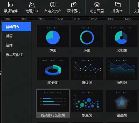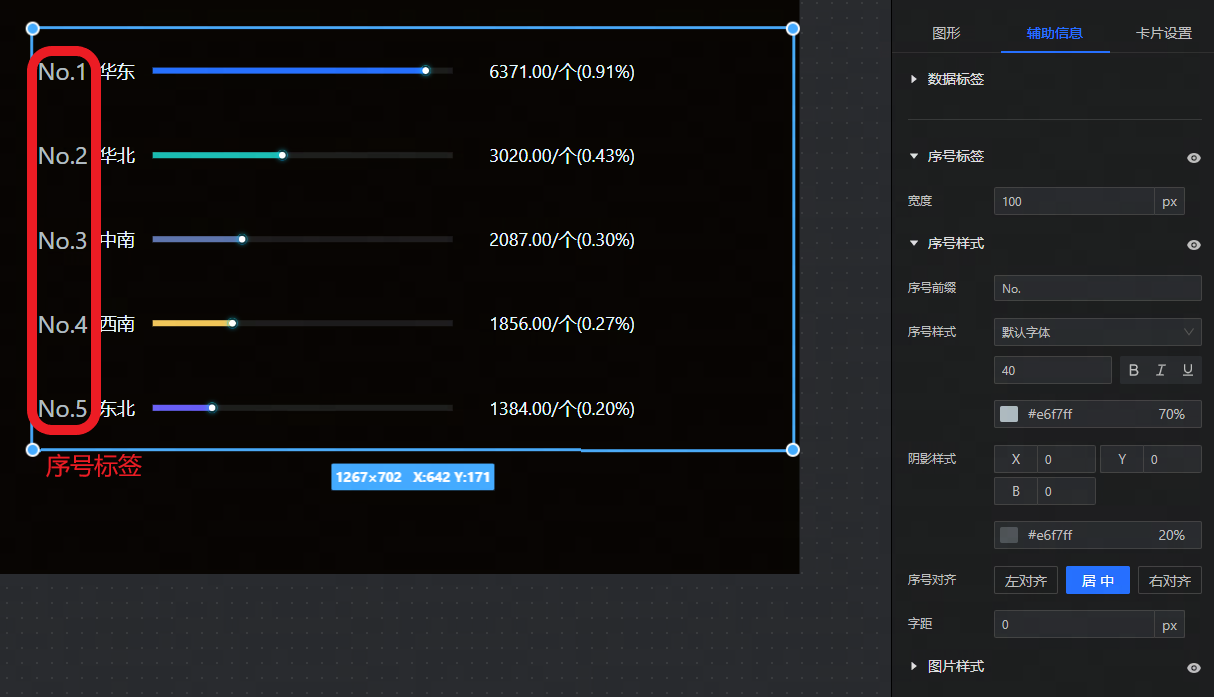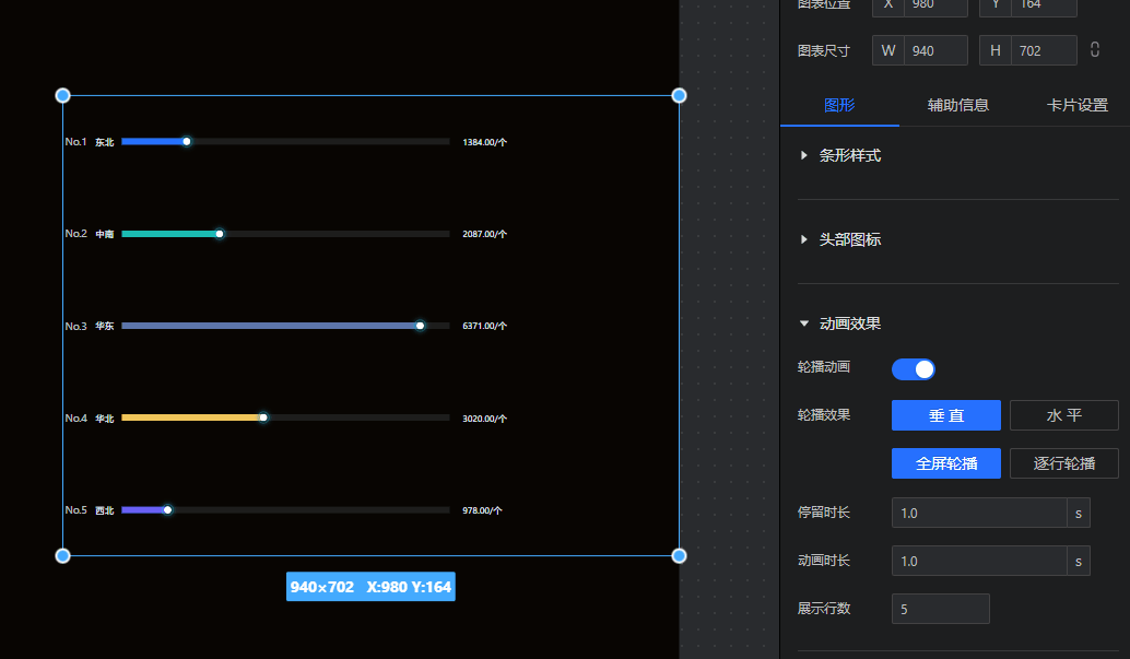 - 序号标签:设置轮播排行条形图是否显示序号标签,以及序号类型、宽度和样式。