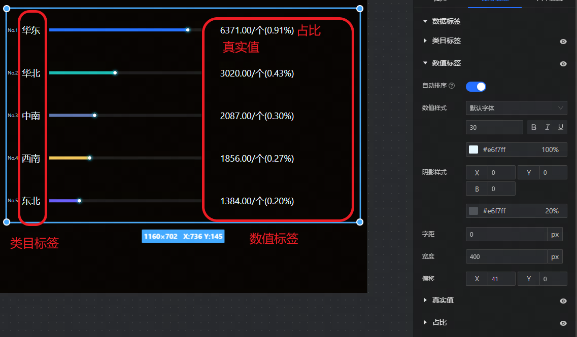 - 数据标签:设置是否显示类目标签或数值标签,以及设置类目标签样式和数值标签样式。