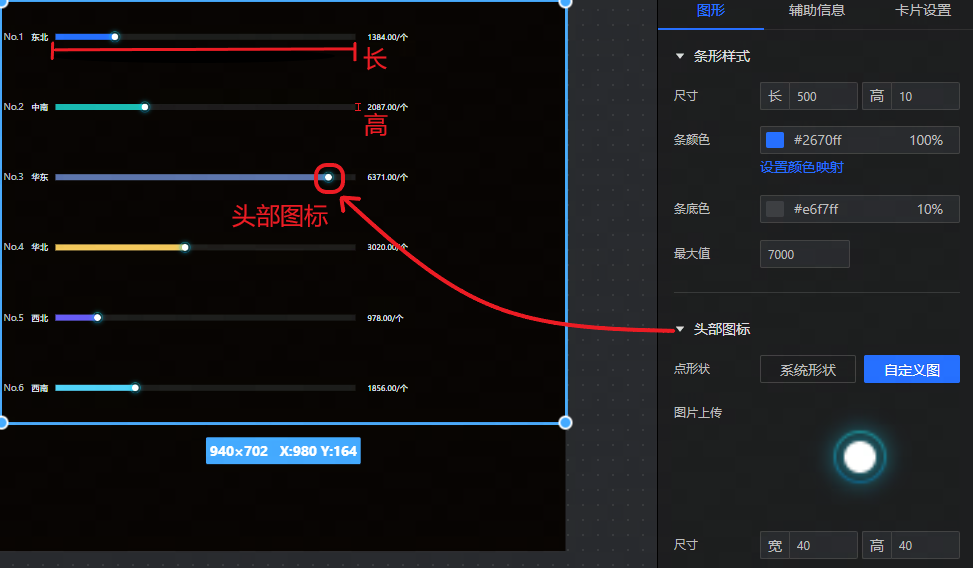 - 条形样式:设置尺寸、条颜色、条底色、最大值。