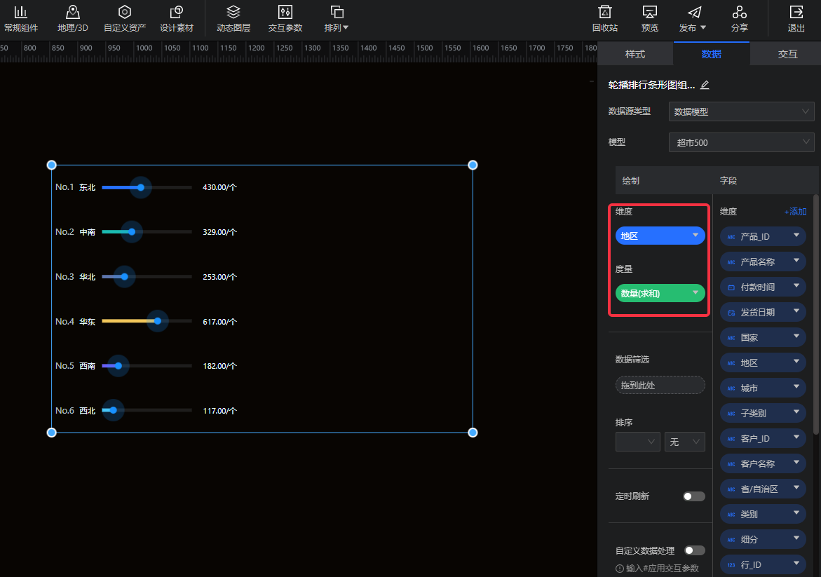 - 维度:轮播排行条形图的维度字段,如下图所示为“地区”。