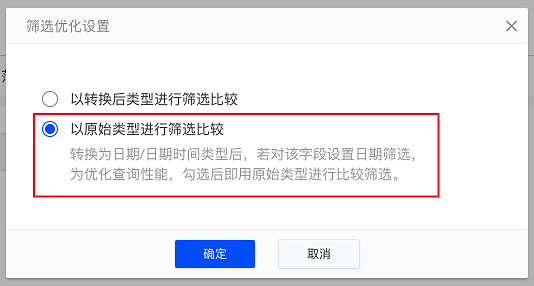 将“字符串”类型的字段转换为“日期、日期时间”类型时,使用原始类型(即字符串类型)进行比较则不需要在SQL中进行字段类型转换,可提高查询性能。