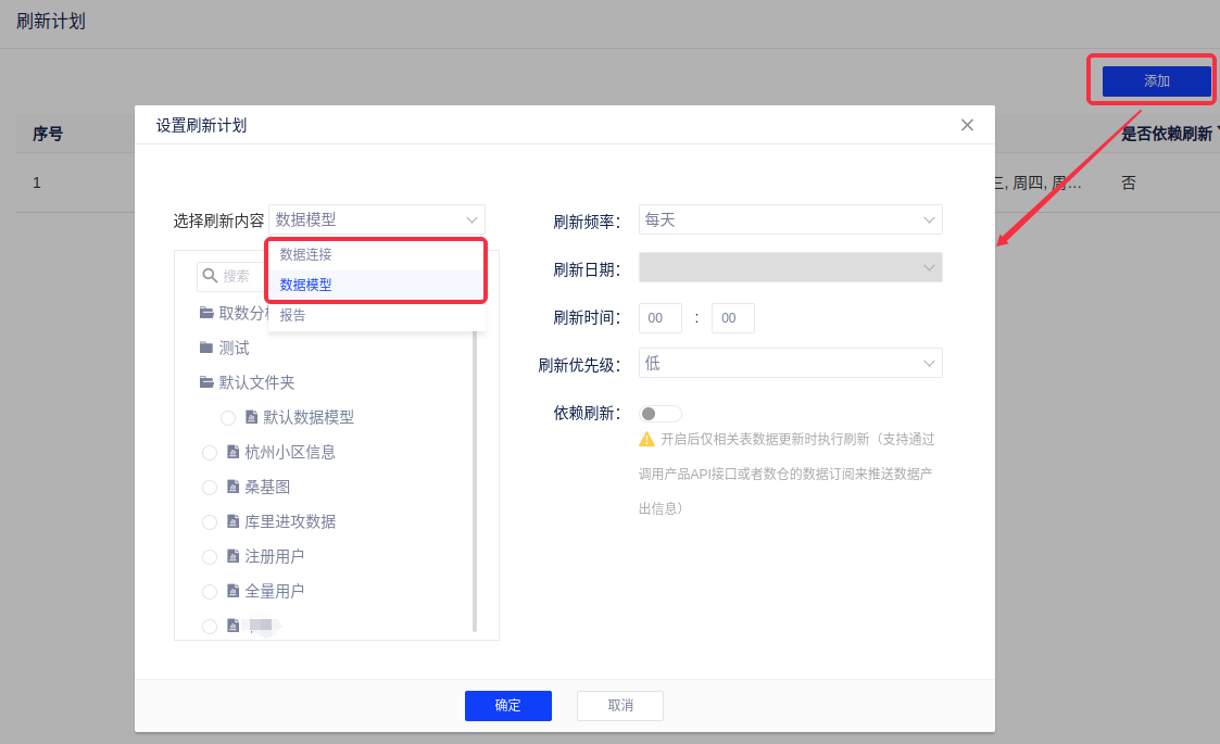 (4)在刷新计划管理界面,可以对数据连接或数据模型添加刷新计划。