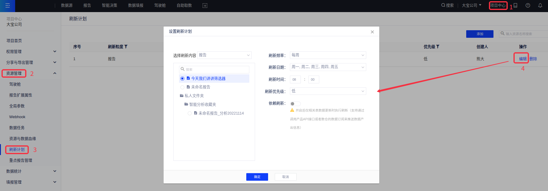 当我们需要报告定时自动去刷新数据时(比如每个工作日早上8点刷新图表数据),可以对报告添加刷新计划(注:只有项目管理员可以使用刷新计划功能)。