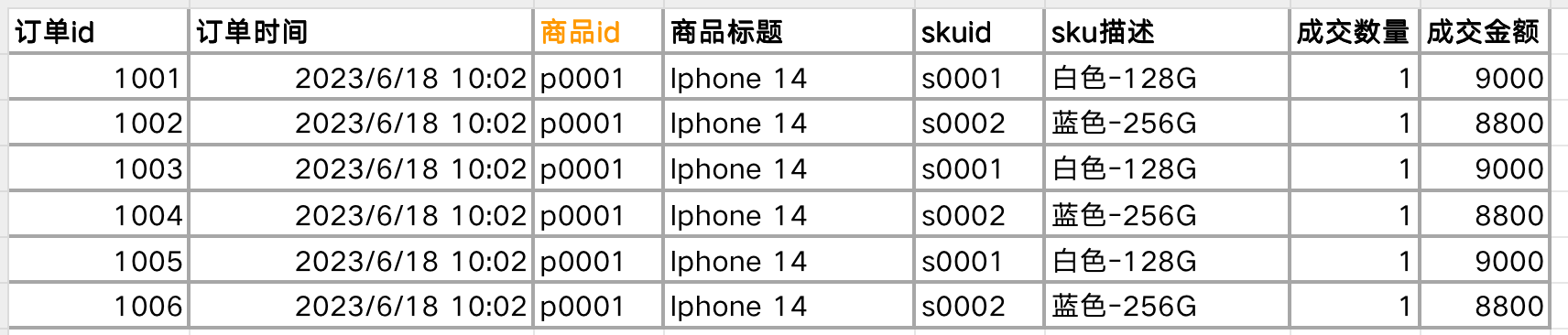 虽然,可以先将表1按照商品id粒度聚合,再跟表2进行关联,如此不会发生数据膨胀的问题。但是表1中的sku、订单等粒度的信息也在聚合的过程中丢失了。无法在分析的过程中下钻到sku或者订单粒度查看交易数据。