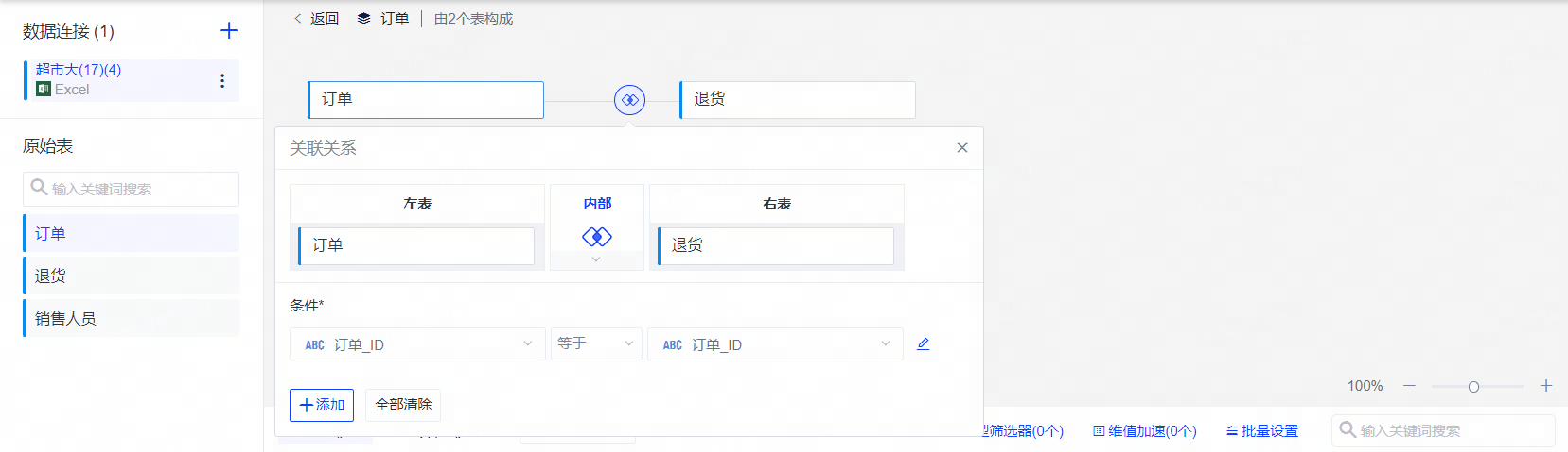 类似于数据模型的创建,拖入两张表时,若它们在原数据库中存在外键关联,则会自动进行关联;若无外键,系统会自动将两张表中相同名称的字段设置为外键进行关联。您可以在此自行添加/修改/删除关联字段。