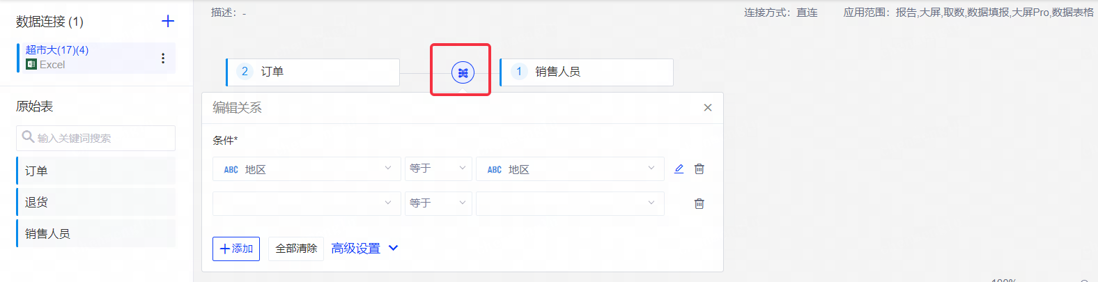 如果公共字段的值不唯一,即“地区”的多个值可以与“销售人员表”中的多个行对应,请选择“多”,如果您不清楚字段的对应情况,也请选择“多”,当前表跟其他表关联时会先聚合再关联;