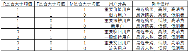RFM经典的分层会按照R/F/M每一项指标是否高于平均值,把用户划分为8类,具体如下: