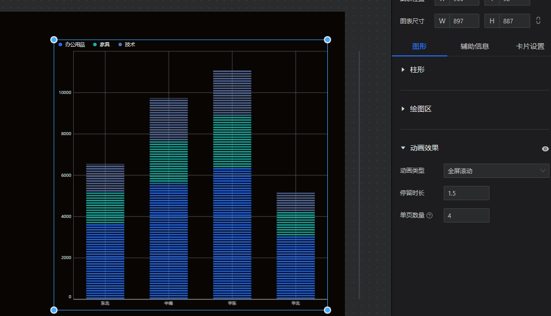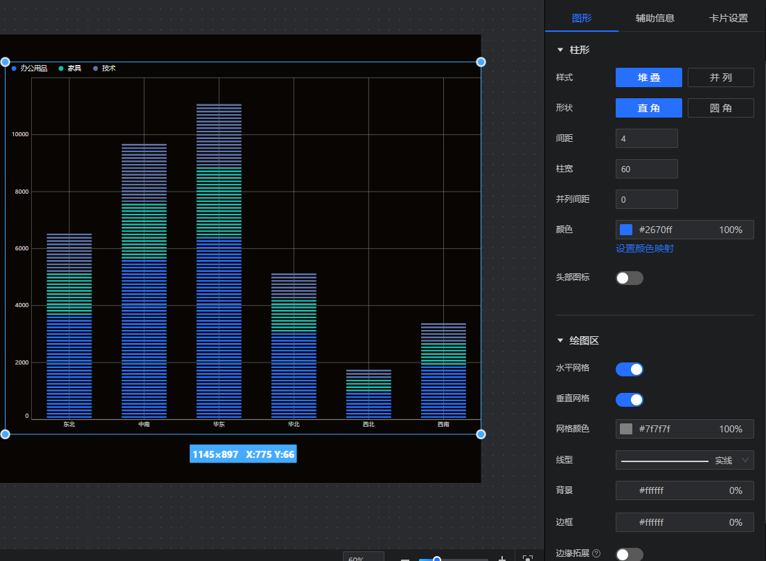 - 柱形:设置柱子为“堆叠”或“并列”,“直角”或“圆角”,栅格的间距,并列间距,柱子宽度以及颜色。