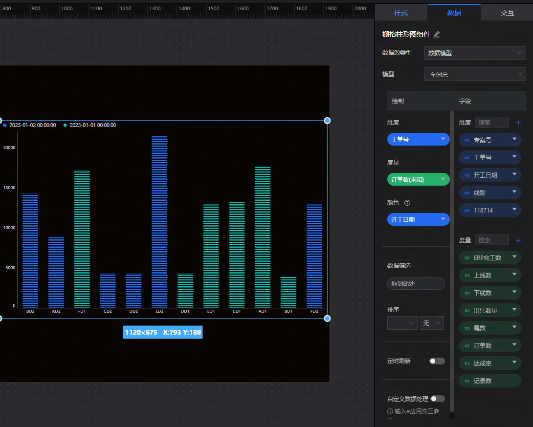 - 颜色(当仅有一个度量字段时可选):以每条柱子的颜色表示某一维度的数值,如下图中的“开工日期”字段。