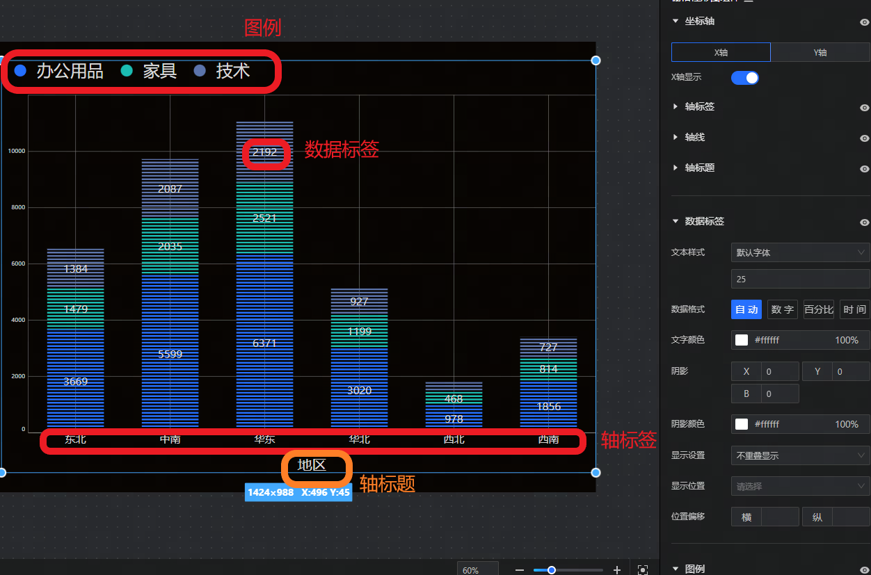 - 数据标签:设置栅格柱形图上是否要展示数据标签,以及标签的文字样式。