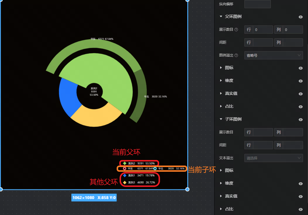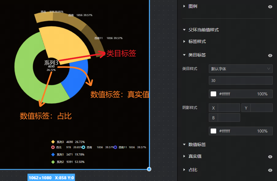 - 父环当前样值:设置是否显示父环的类目标签或数值标签,以及设置类目标签样式和数值标签样式。