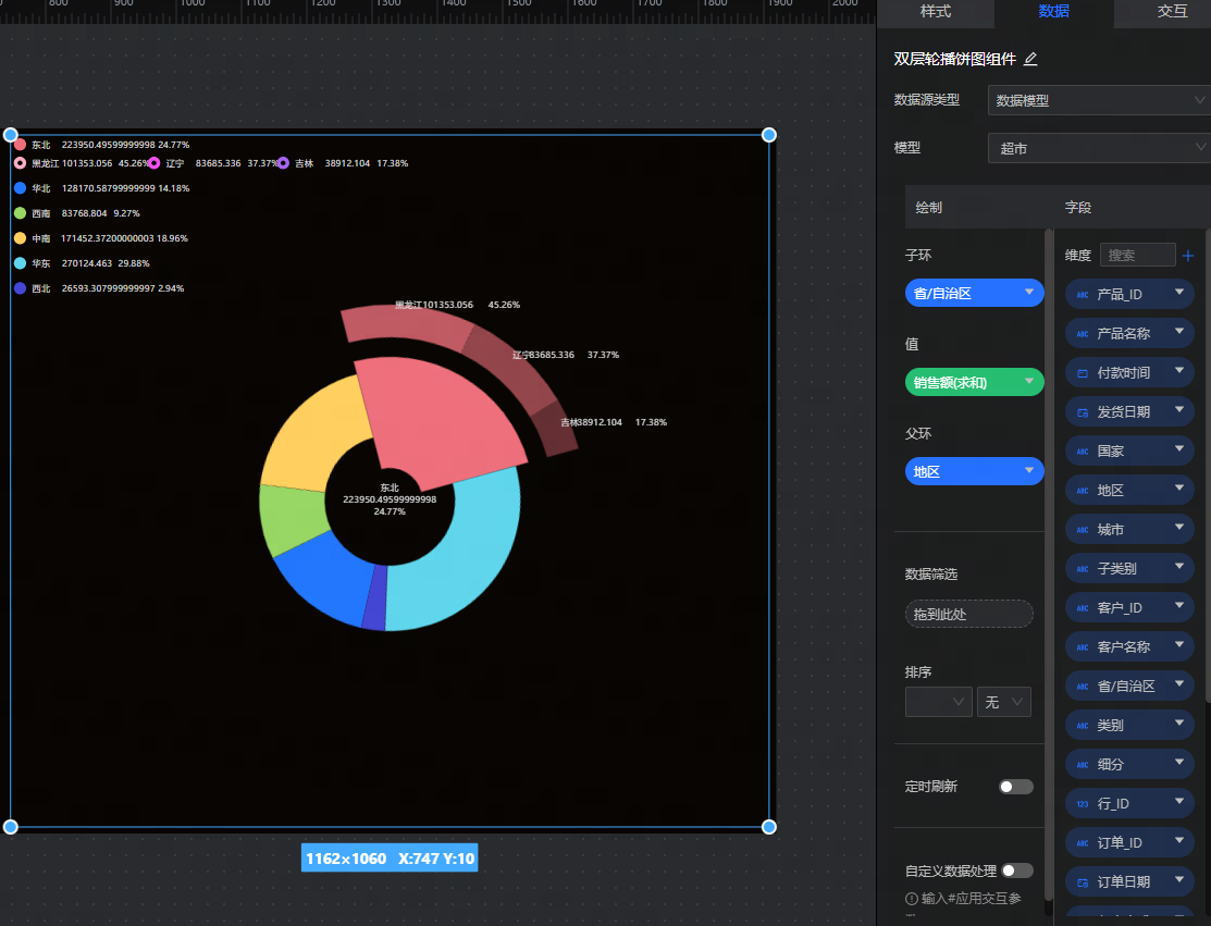 - 父环:即内圈环,设置双层轮播饼图的维度字段,如下图所示为“地区”。