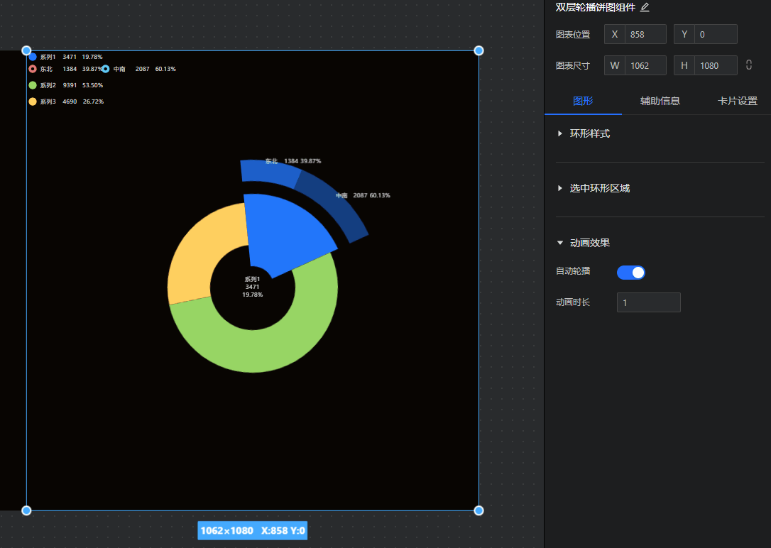 - 图例:设置双层轮播饼图是否要展示图例,以及图例的展示位置、文字样式。
