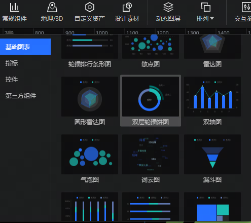 在编辑状态下点击双层轮播饼图组件即可对其进行配置,配置内容分为样式、数据和交互三个Tab。(本节仅介绍双层轮播饼图特有属性的配置,基础图表共性的配置请参考下文"组件配置")