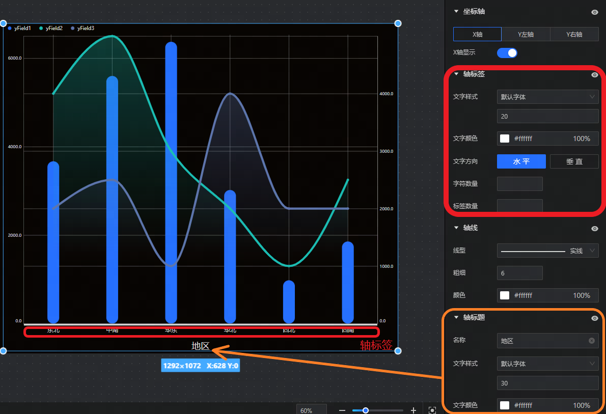 - x轴:设置x轴的维度字段,如下图中的“地区”字段。