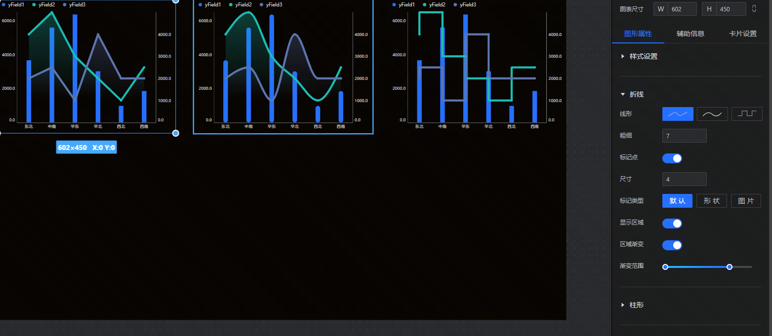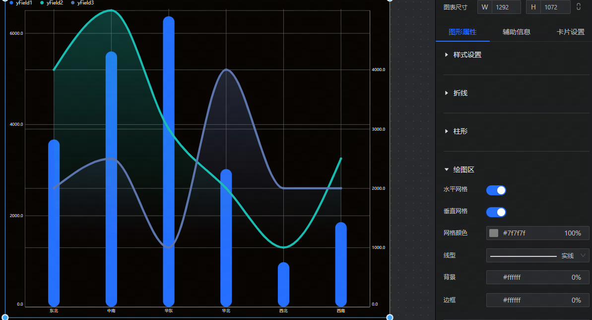柱形部分与柱形图相同,折线部分与折线图不同的是,折现部分支持设置显示区域,暂不支持设置线型。