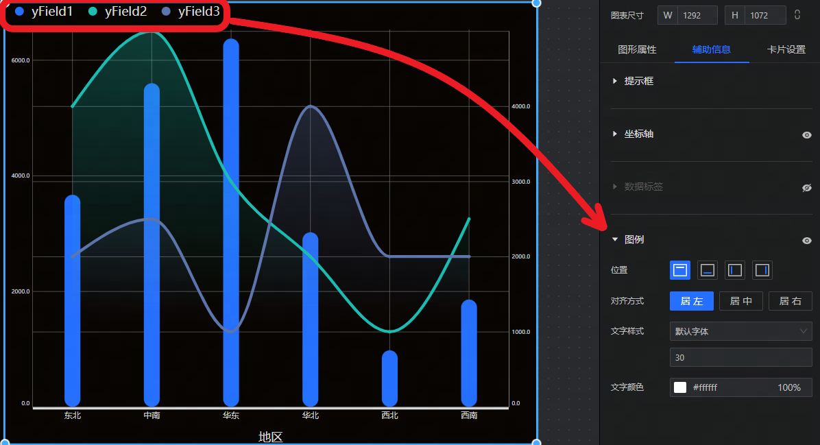 - 图例:设置双轴图是否要展示图例,以及图例的展示位置、文字样式。