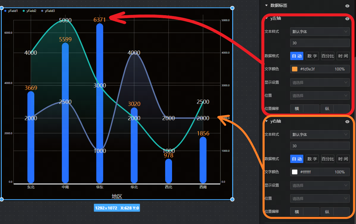 - 数据标签:设置双轴图上是否要展示数据标签,以及标签的文字样式。