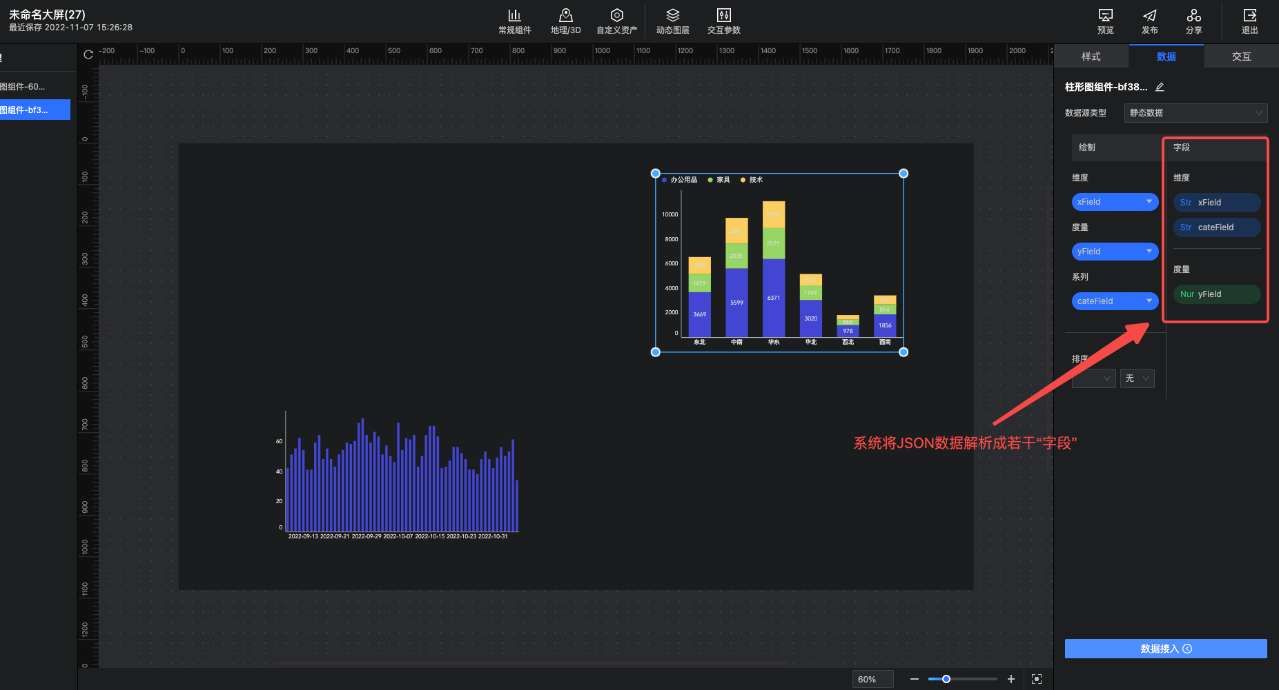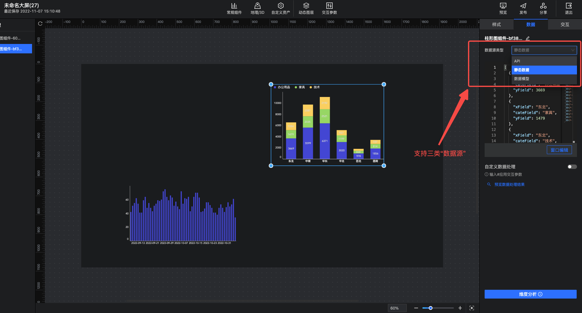 - 静态数据:添加组件后,系统会自动为组件设置一段静态的JSON数据,用户可修改JSON数据,直观看到组件的变化。适用于大屏搭建阶段。可以敏捷地使用假数据调试,更快地看到大屏效果。同时避免搭建阶段就产生大量数据请求,减少搭建阶段的编辑器性能消耗。