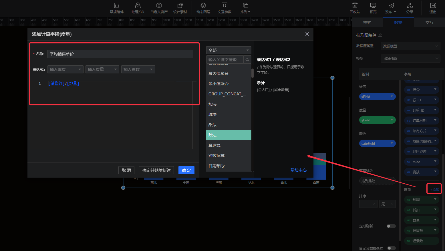 点击字段列表区中度量右侧加号,弹出添加计算字段配置框,依次输入新字段的“名称”和“表达式”。其中,表达式支持插入维度、度量和参数字段。