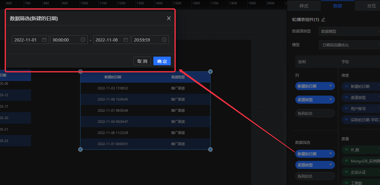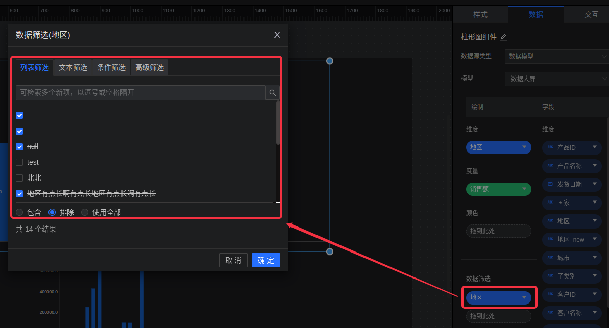 当组件的数据源为“数据模型”时,则可对数据进行筛选操作。支持拖入字段配置数据筛选条件,可拖入多个字段。