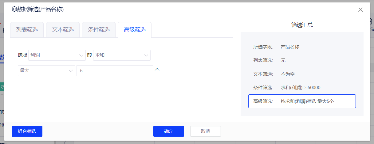 - 高级筛选可以帮助用户按照某个度量的聚合结果最大或最小的N个筛选该维度字段。