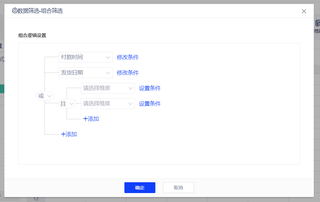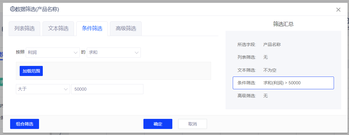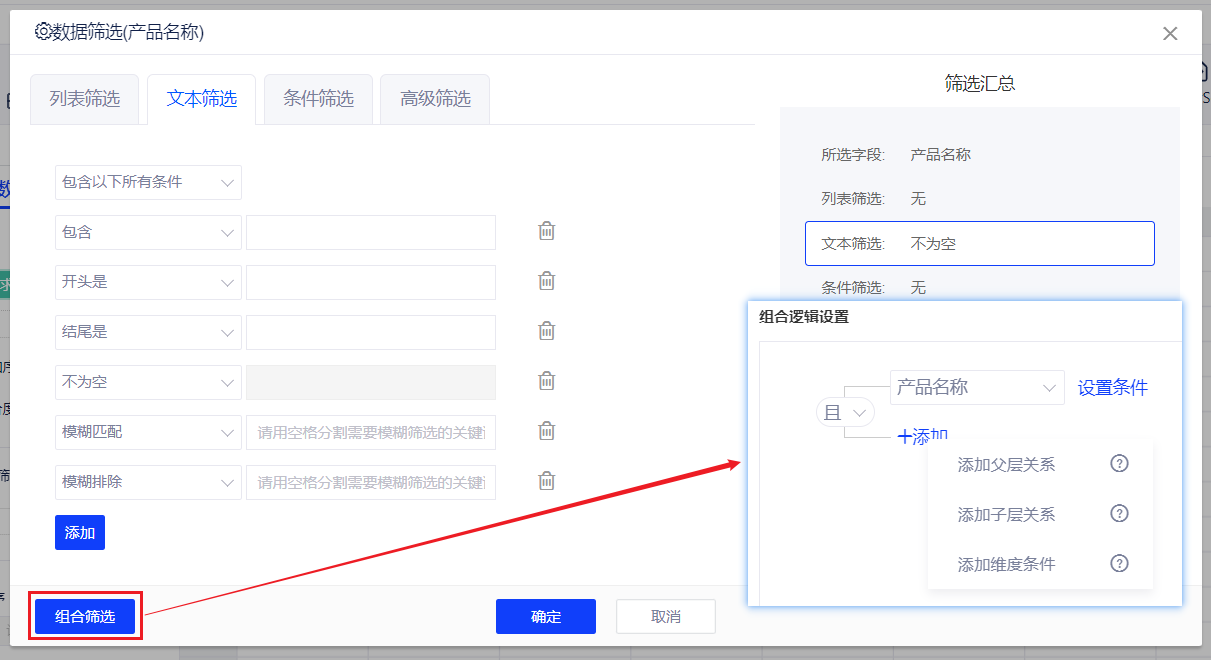 - 在配置窗口中点击“组合筛选”即可进入组合筛选配置。
