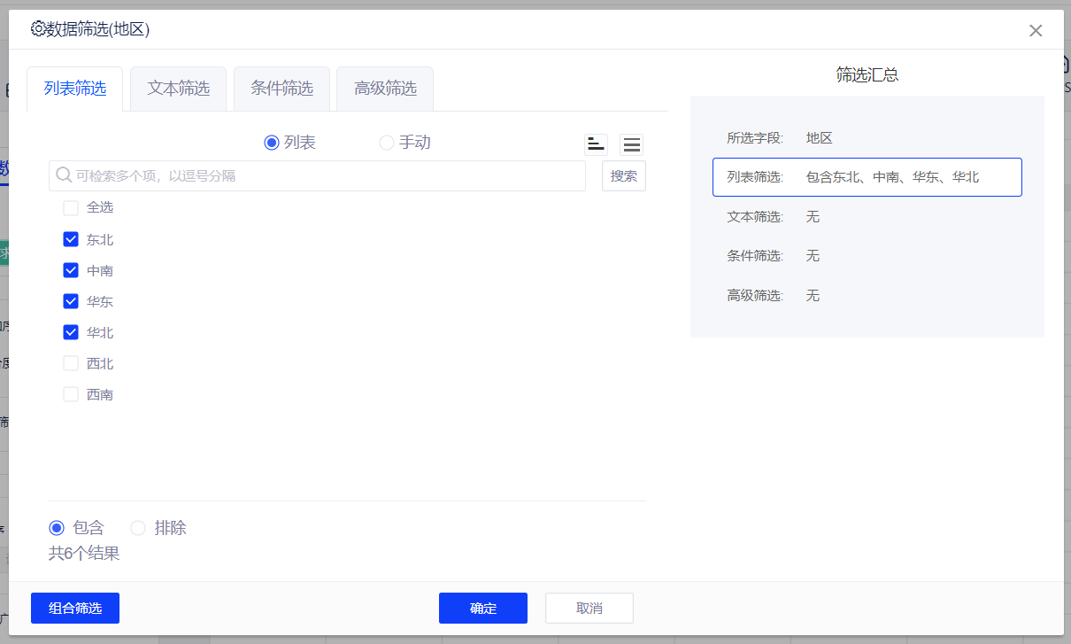 - 将该字段的所有值显示成一个列表,通过勾选列表中的字段值,搭配“包含”或者“排除”功能进行筛选。也可手动输入筛选内容。