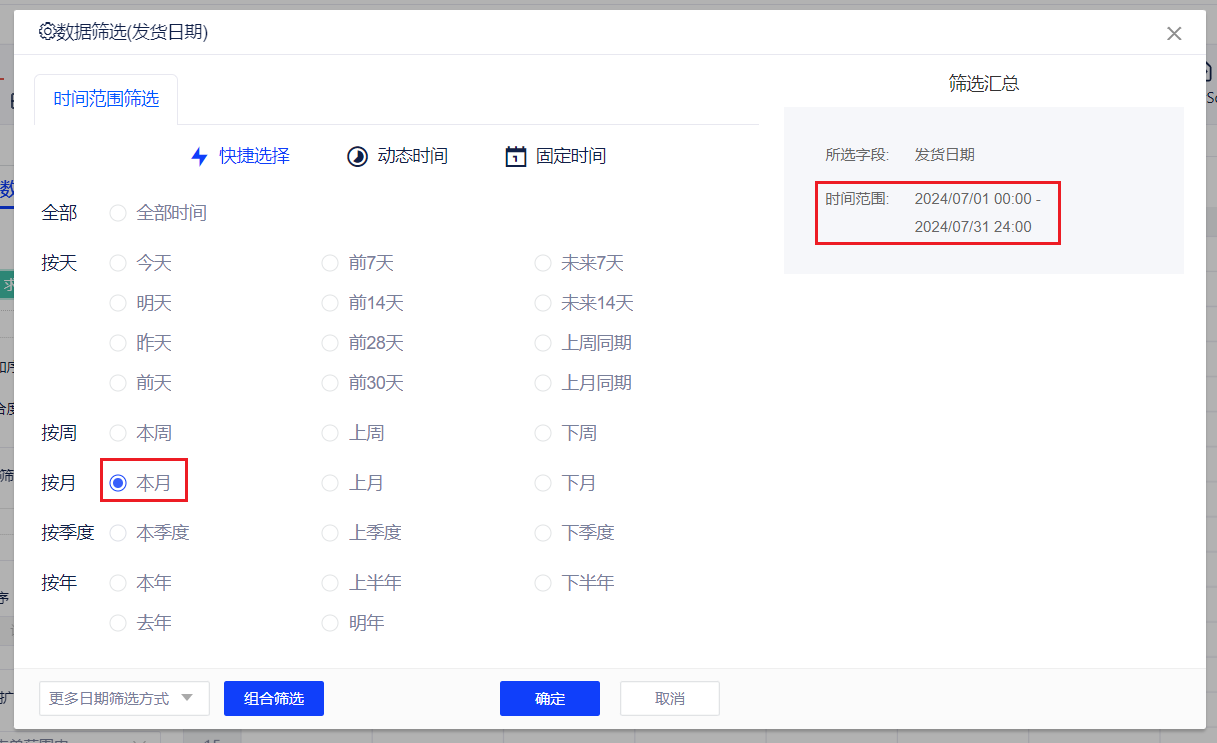 - 支持以天、周、月、季度、年为跨度的快捷选择,右侧会展示快捷选择对应的时间范围。