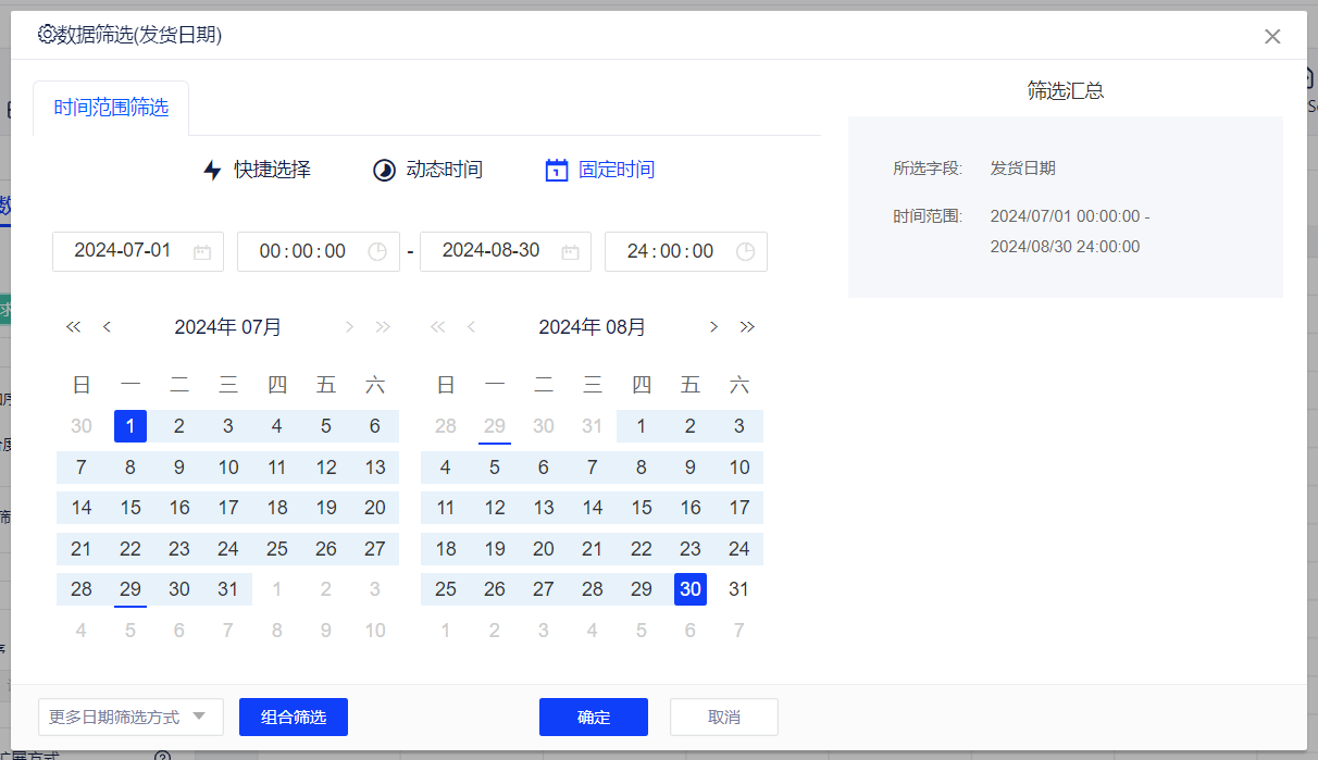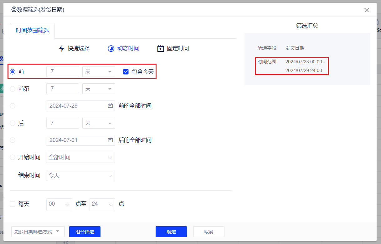 - 将日期时间类型的维度拖入表配置区的“数据筛选”位置,将弹出配置窗口,支持快捷选择、动态时间、固定时间以及组合筛选。