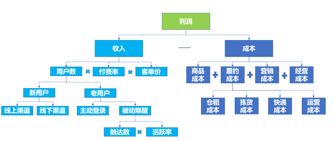 杜邦分析是最常用的分析方法之一,通过问题的层层拆解、分析,确定每一层次的表现情况,帮助最终分析出问题的主要矛盾。最常见的就是电商的利润模型,可见下图,在按公式、结构的拆解后,可以清晰的定位到[利润]变化的主要原因和次要原因: