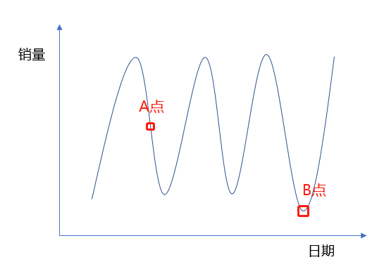 比如下图的销售周期趋势图,销量会周期性的发生波动,所以A点虽然是在走下行趋势、但属于正常情况,但B点是销售周期的低谷、且低于之前的周期低谷,所以会存在问题。