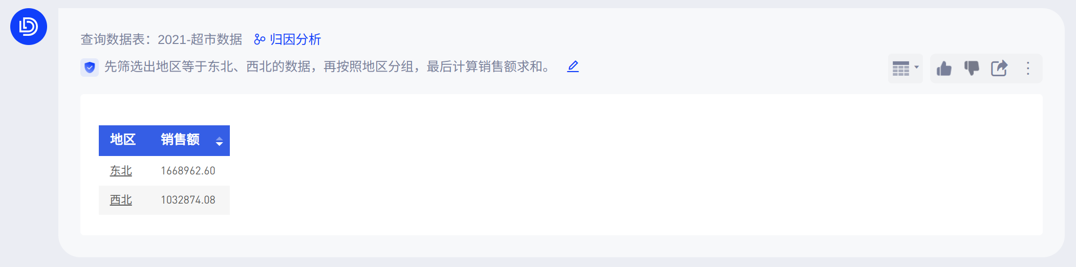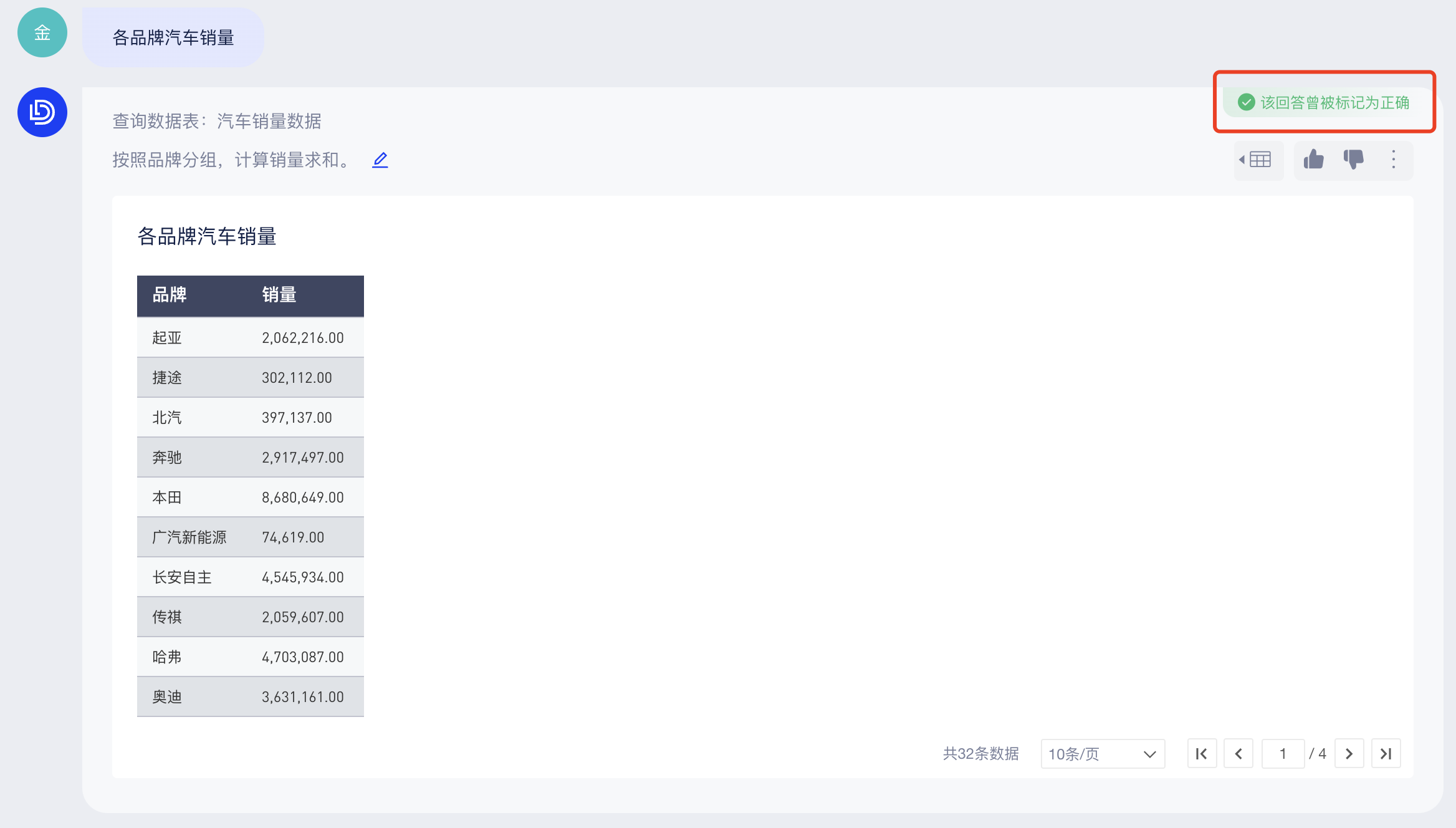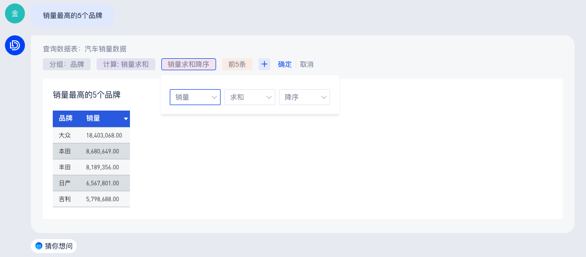 自然语言方式透出所选的数据表和AI的取数逻辑(自然语言描述和实际取数逻辑100%等价),业务用户可以通过取数逻辑判断结果的准确性。