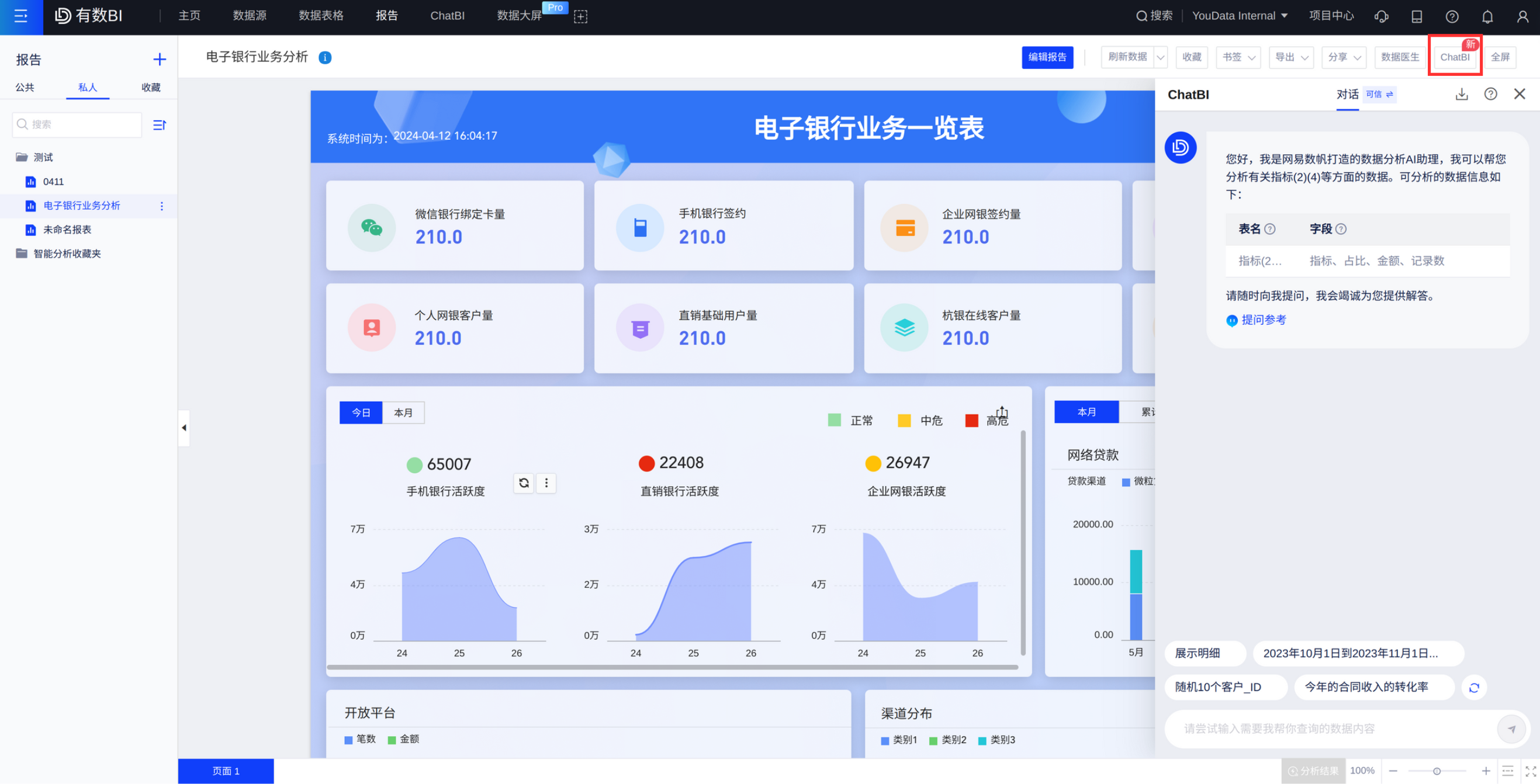 方式一:从有数BI的左侧导航点击“ChatBI",即可进入ChatBI的聊天窗口,如下图:
