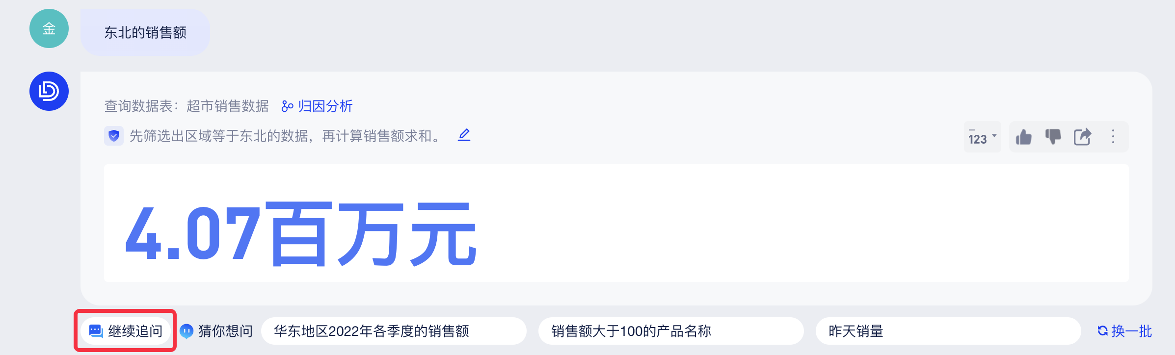 (1)点击「继续追问」按钮,则进入多轮对话状态,自动联系上下文内容为您回答。
