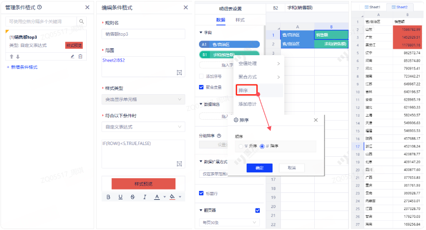 - 条件格式依排列顺序自上而下优先级逐级降低,后设置的条件格式(即靠上的条件格式)优先级高于先设置的条件格式。