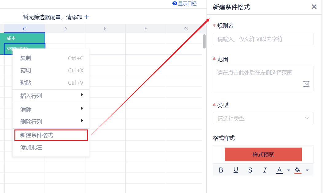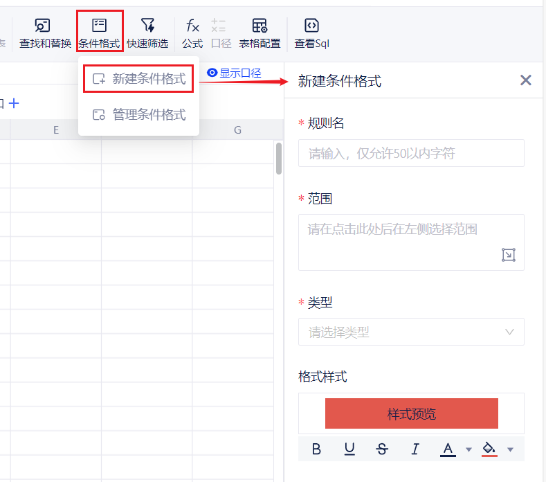 在选择类型为自定义表达式后,支持用户通过输入自定义公式配置条件格式,并对满足格式条件的单元格应用格式样式。