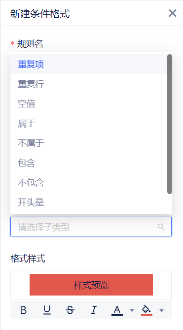 - 属于、不属于:判断用户选择范围内的值是否属于目标项(子集),并对满足内容条件的单元格应用格式样式。