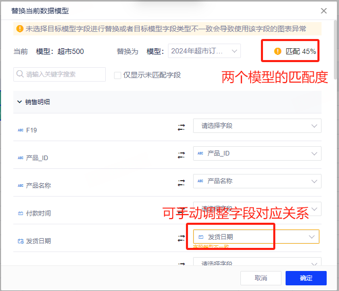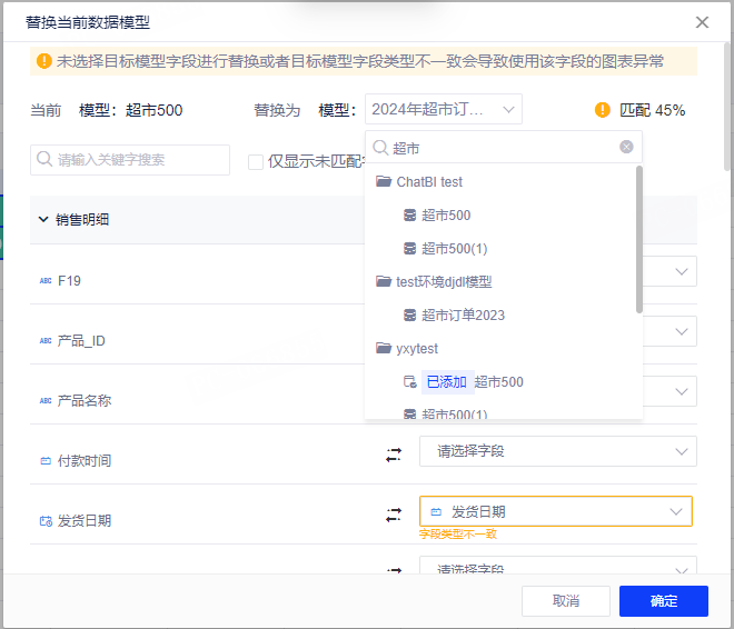 - 未选择目标模型字段进行替换或者目标模型字段类型不一致会导致使用该字段的图表异常;