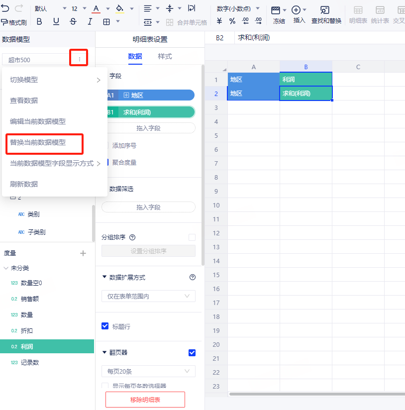 (1)在数据表格编辑界面的左上角点击“更多”后选择“替换当前数据模型”;