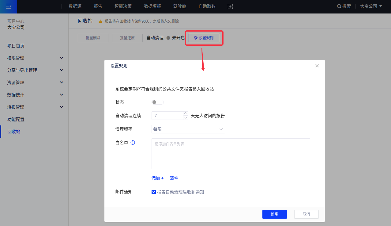 (2)可设置回收站的规则,系统会定期将符合规则的公共文件夹报告移入回收站,如图所示: