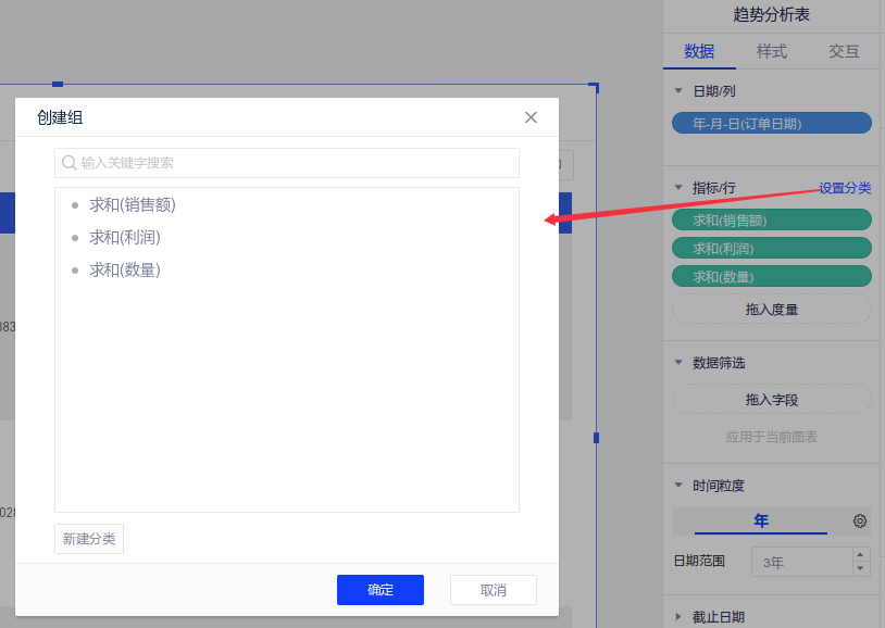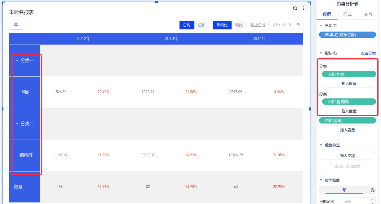 (2)设置分类后,指标/行面板按分类顺序排列,展示分类名以及分类下字段。
