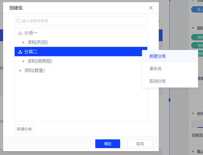 (1)点击指标/行区域右上角[设置分类]出现设置分类弹窗: