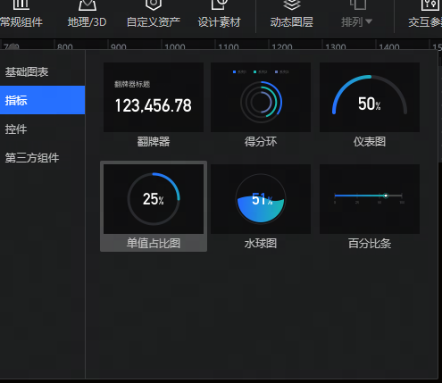 翻牌器的数据配置:翻牌器的作用是显示某一度量的数值,当用户将数据Tab下的某一度量值拖入到翻牌器的数值选项下时,翻牌器即可显现其数值。