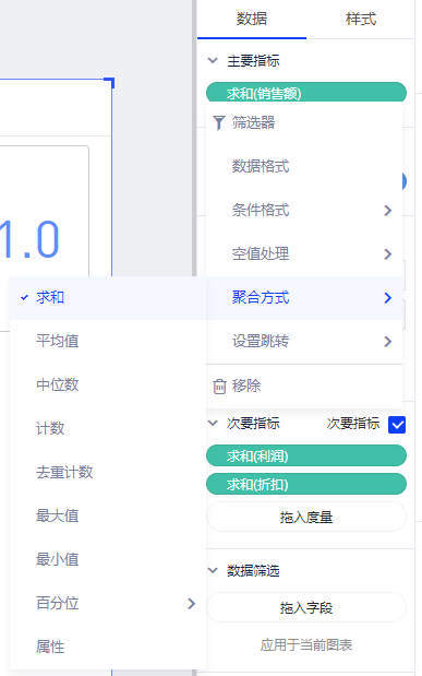 (5)指标看板的主要指标和次要指标均支持:筛选、数据格式、条件格式、空值处理、聚合方式、跳转等操作,具体规则与指标卡均保持一致。